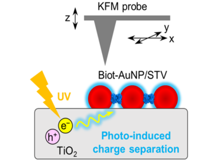 利用生物素-链霉亲和素复合物可将AuNP有效结合到TiO2颗粒表面。设计实验,制备两种样品,一种是没有生物素-链霉亲和素复合物的对照样品,以及使用生物素-链霉亲和素复合物的样品,在照射紫外光及不照射紫外光的条件下,分别测量固定在TiO2上的AuNP的表面电位分布,以可视化光致电荷分布。