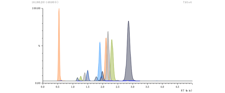 常见毒品及代谢物的定量离子色谱图(5.0 ng/L)