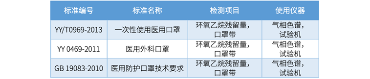 目前,一次性使用医用口罩执行标准为中华人民共和国医药行业标准YY/T0969-2013《一次性使用医用口罩》,医用外科口罩执行标准为中华人民共和国医药行业标准YY 0469-2011《医用外科口罩》,医用防护口罩执行标准为中华人民共和国医药行业标准GB 19083-2010《医用防护口罩技术要求》,标准中均规定,使用气相色谱法定量分析口罩环氧乙烷残留量,试验机测试口罩带连接强度等。
