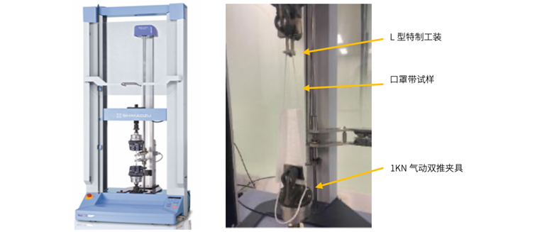 利用岛津桌上型电子万能试验机AGS-X 1kN和岛津1KN气动双推夹具(配合特制L型工装),将口罩带拉伸到10N并保载5秒后,口罩带没有脱离口罩本体,说明口罩带的强度符合相关标准要求,由此可以判定测试的口罩带连接强度复合标准要求。