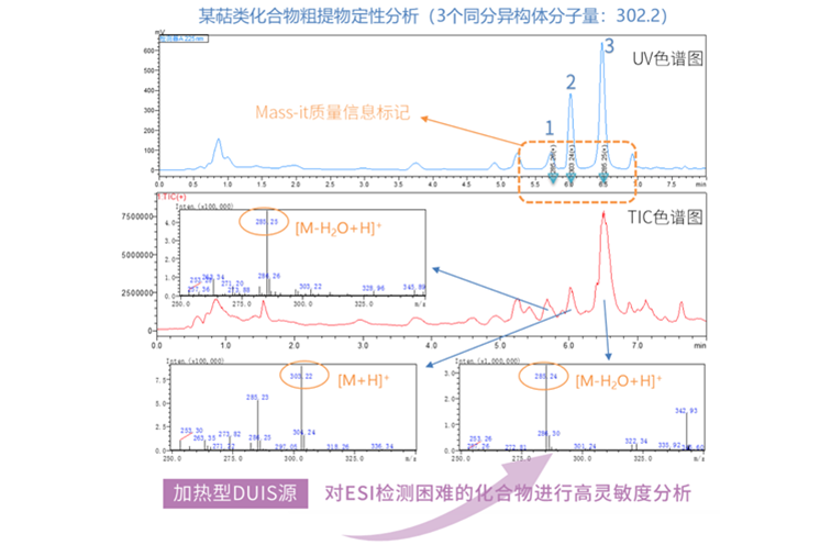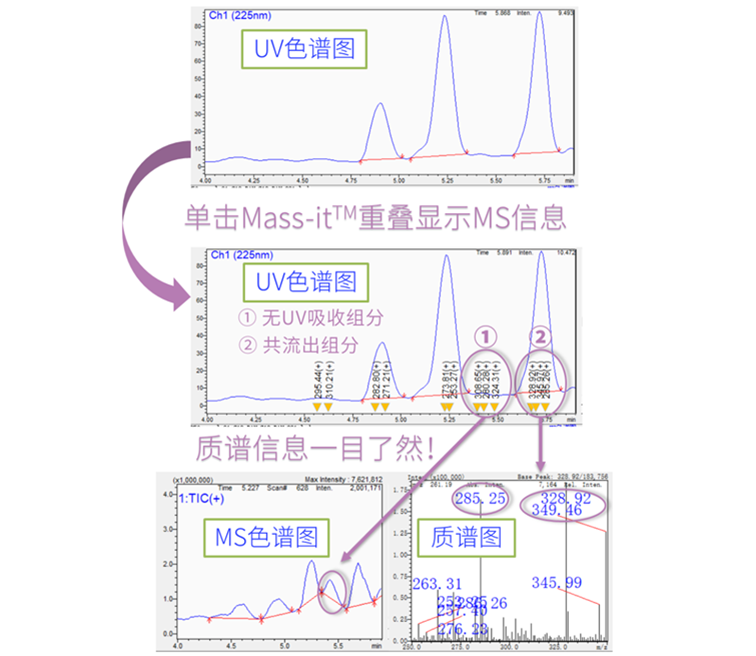 Mass-it?是一项显示质谱信息的新功能,它将检测到的特征质量数信息同步叠加到UV/PDA色谱图上,这使得可以发现多个组分在单个色谱峰中共流出的位置,以及没有紫外吸收的“ 隐藏” 组分的位置。