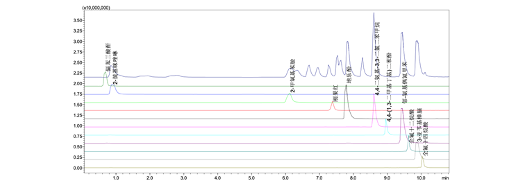 SVHC (Substance of Very High Concern)是一类对人类健康和环境有严重危害的物质,其数量繁多,极性范围广,对于部分弱极性物质,难以用ESI源分析;借助LCMS-2050的DUIS源,配合Shim-pack GIST C18 色谱柱 ( P/N: 227-30001-04,岛津(上海)实验器材有限公司)可在17min内实现LogP 跨度为0.66~13.08的11种SVHC物质的快速检测。