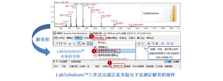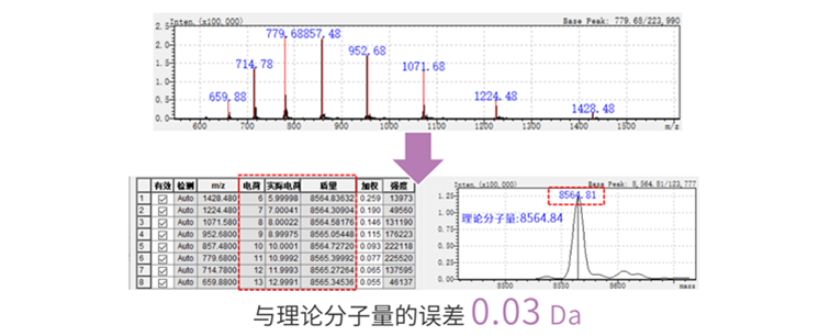 LCMS-2050的宽质量范围(m/z 最大可设到2000)能获得更多的解卷积峰,这使得分子量的计算结果更可靠,是测定大分子化合物分子量的有力工具,利用LabSolutions软件的解卷积多电荷分析功能只需3步即可完成高精度分子量计算,参见如下案例: