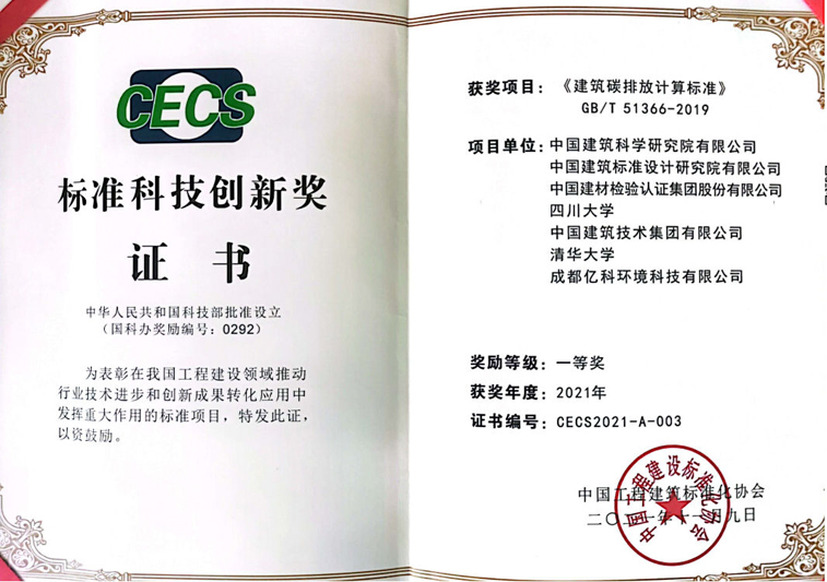 国检集团代表建材行业参加的GB/T 51366-2019《建筑碳排放计算标准》获评2021年度中国工程建设标准化协会“标准科技创新奖”一等奖。