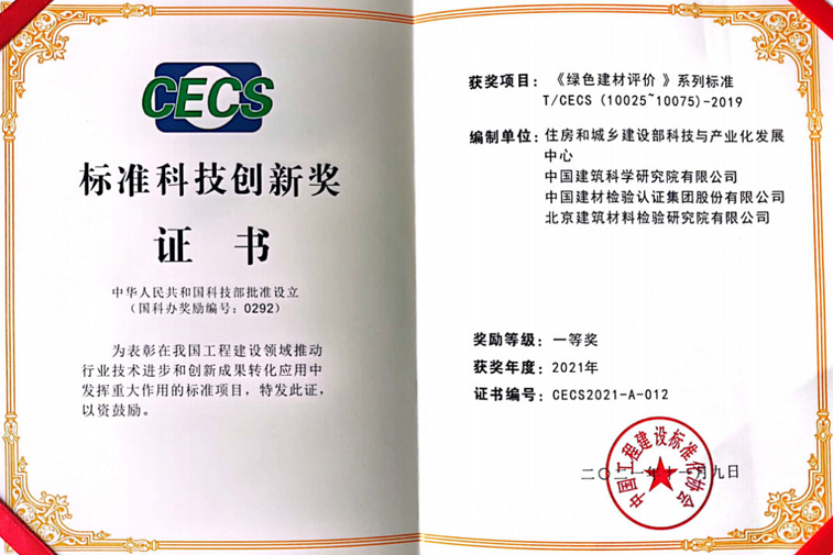 同时,由住建部科技与产业化发展中心牵头,国检集团作为核心成员参与的《绿色建材评价》系列标准(T/CECS 10025~10075)获评2021年度中国工程建设标准化协会“标准科技创新奖”一等奖。