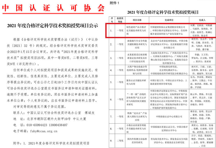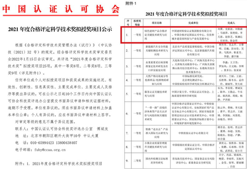 日前,中国认证认可协会公示“2021年度合格评定科学技术奖”拟授奖项目,由国检集团牵头,会同中国合格评定国家认可中心(CNAS)、住建部科技与产业化发展中心共同申报的“绿色建材产品合格评定关键技术研究与应用”喜获“合格评定科学技术奖”一等奖。