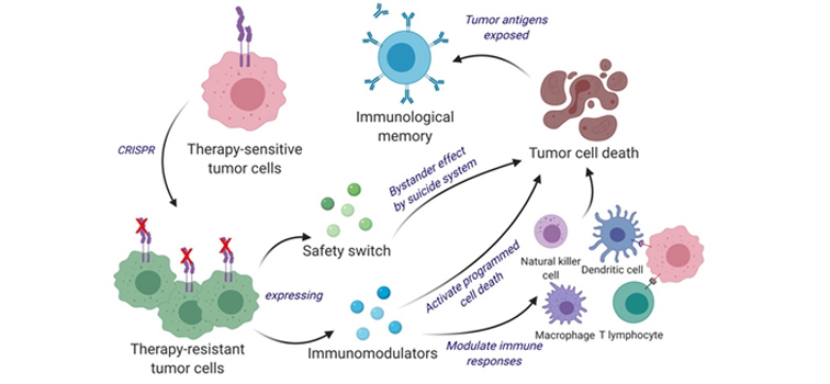 就像信鸽返回栖息地一样,活肿瘤细胞会在大脑中长途跋涉,并回到同伴那里。利用这个特性,研究团队使用基因编辑工具CRISPR-Cas9改造了活肿瘤细胞,并重新利用它们释放肿瘤细胞杀伤剂。编辑后的肿瘤细胞被设计成表达因子,使它们易于被免疫系统发现、标记和记忆,为免疫系统的长期抗肿瘤反应做好准备。