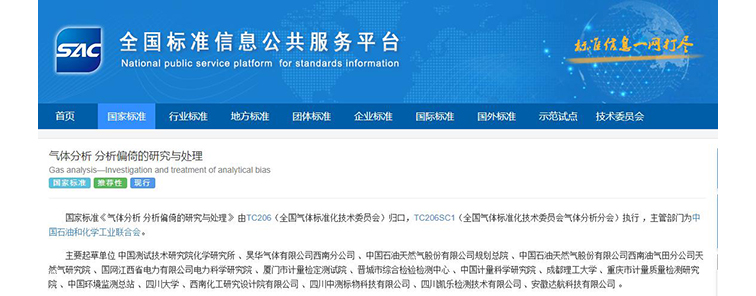 中国测试技术研究院化学研究所牵头完成的国家标准《气体分析 分析偏倚的研究与处理》正式发布实施