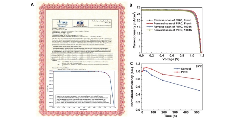 图2 (A)第三方权威机构美国Newport认证书,认证效率为25.6%,插图为认证效率曲线,(B)有无稳定二次相PIRC器件放置的电流-电压曲线,(C)有无稳定二次相PIRC器件在85oC加速老化下的稳定性。