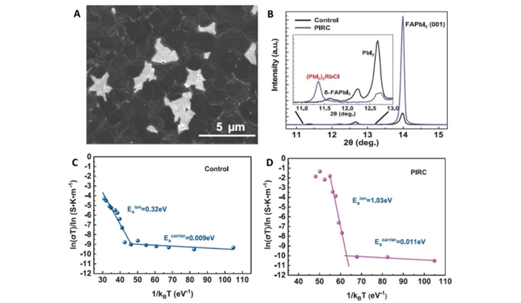 图1 (A)具有PIRC二次相钙钛矿的扫描电子显微镜照片,(B)有无PIRC的钙钛矿薄膜X射线衍射图谱(插图为局部放大图),(C)与(D)分别为有无PIRC的钙钛矿电导与温度关系图。