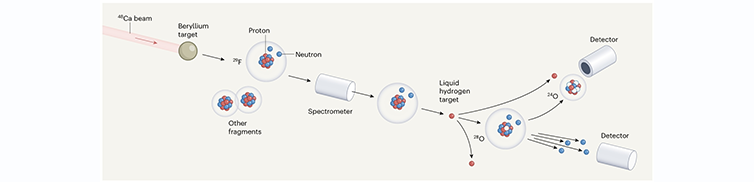 在前述研究中,氧-27、氧-28是被人为制造出来的:他们将一束高强度的稳定的钙-48同位素光束激发到总能量约为160亿电子伏特,轰击一个旋转的铍靶。碰撞使钙-48分裂成更轻的原子核,其中大部分是寿命较短的稀有同位素。碎片飞过一个光谱仪,筛选出同位素氟-29。后者只比氧-28多一个质子。氟-29随后与液氢相撞,被“剔掉”一个质子,从而产生氧-28。
