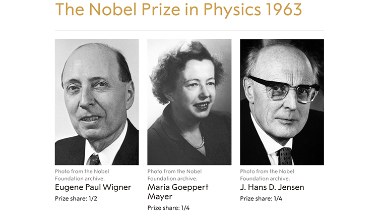 因对原子核和基本粒子理论所做的贡献,特别是对称性基本原理的发现和应用,1963年,美籍物理学家尤金·保罗·维格纳(左)被授予诺贝尔物理学奖;因在核壳结构方面的发现,当年,美籍物理学家玛丽亚·格佩特·迈耶(中)和德国海德堡大学教授约翰内斯·汉斯·丹尼尔·延森(右)也被授予了诺贝尔物理学奖。