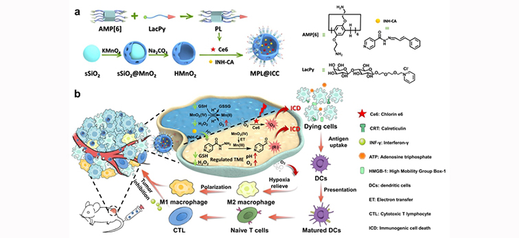 近年来,基于癌症纳米疫苗的免疫疗法,由于其潜在的高疗效、特异性和可产生长期免疫记忆效应的能力,有望成为改变癌症治疗模式、根除肿瘤和预防肿瘤复发的最有效方法之一。然而,较差的免疫原性和免疫抑制的肿瘤微环境限制了纳米疫苗介导的免疫疗法的治疗效果。鉴于此,该团队设计和制备了一种Mn(III)介导生成的碳中心自由基提高免疫原性细胞死亡(ICD)的纳米疫苗(MPL@ICC)用于增强免疫疗效。MPL@ICC由氨基柱[6]芳烃和乳糖吡啶主客体络合物修饰的二氧化锰(MnO2)纳米载体负载异烟肼前药和二氢卟吩e6组成。该纳米疫苗具有良好的生物安全性、对肝癌细胞的靶向性和肿瘤部位的富集性。最重要的是,它可以调节肿瘤微环境使Mn(III)得以稳定存在,Mn(III)进一步介导碳中心自由基的生成,从而加强ICD实现增强的免疫治疗效果。该工作为设计高效的癌症治疗型纳米疫苗实现肿瘤消除和预防肿瘤复发提供了一种新的策略。