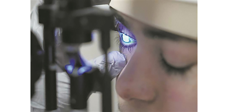 在基因治疗之前,医生对安东尼奥的眼睛进行染色后,在蓝光下检查他的眼睛是否出现更多溃疡。