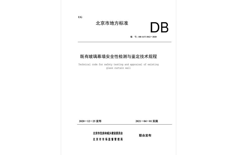 2021年,国检集团主编的北京市地方标准《既有玻璃幕墙安全性检测与鉴定技术规程》DB11/T1812-2020 正式实施。该标准首次引入基频相对法和排序定位法,进一步提升了既有玻璃幕墙面板坠落风险预测预警技术的可操作性及适用性,达到国内领先水平。同时,该标准明确了既有玻璃幕墙安全性鉴定的基本方法和内容,对指导和规范北京市既有玻璃幕墙的安全性检测与鉴定,保障城市居住环境安全具有重要意义。