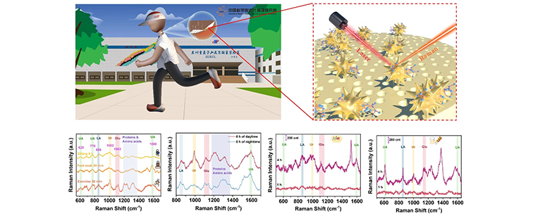 科研人员借助兰州重离子研究装置(HIRFL),通过在离子径迹蚀刻聚碳酸酯(PC)膜上原位合成金纳米星(AuNSs),制备了一种可穿戴纳米多孔柔性SERS基底用于汗液富集和分析。由于基底具有纳米多孔结构,能够有效地快速收集分析物,在10?4到10?13?M的分析物浓度范围内表现出良好的信号重现性和均匀性,并且可以从收集的汗液中给出乳酸和尿酸等物质信息的变化。