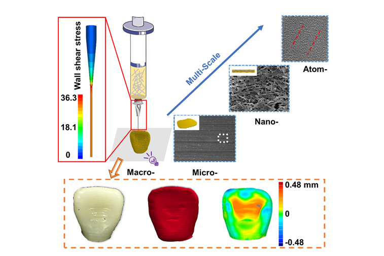 东华大学纤维材料改性国家重点实验室朱美芳院士、张耀鹏教授受到天然牙齿中牙釉质多阶段生长的启发,基于单分散的“超重力+”HAp基齿科修复树脂材料,采用挤出成型3D打印技术,开发了一种自下而上的逐步组装策略,利用剪切诱导构建了多尺度高度有序HAp结构的高精度仿生牙冠(图1),实现了天然牙的成分(HAp)、结构(紧密有序)以及性能(力学及再矿化)仿生。相关成果以题为3D Printed Strong Dental Crown with Multi-Scale Ordered Architecture, High-Precision, and Bioactivity发表在Advanced Science上,博士生赵梦露为第一作者,北京化工大学博士生杨丹蕾、范苏娜博士、姚响副教授和北京化工大学王洁欣教授为共同作者,张耀鹏教授和朱美芳院士为共同通讯作者。部分实验完成于上海光源BL19U2线站,北京化工大学合作制备“超重力+”羟基磷灰石。