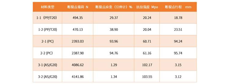 我们选取几种塑料材料:PP(高聚物聚丙烯)/PC(聚碳酸酯)/AS(丙烯腈-苯乙烯共聚物),进行拉伸弯曲试验。