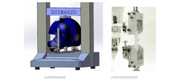 通过使用定制夹具,岛津试验机可以根据《GB 811-2022 摩托车、电动自行车乘员头盔》进行头盔刚度试验,也可以对头盔扣带进行单独试验。