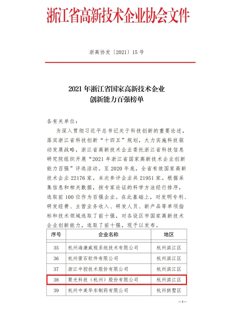 喜报 | 聚光科技入选2021年浙江省高新技术企业创新能力百强榜单