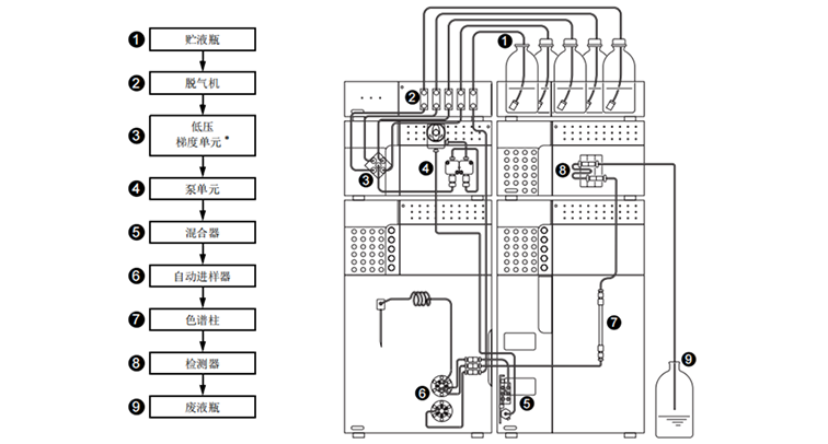 1、检查压力是否正常。如压力偏低,则可能存在漏液的地方;如压力偏高,则可能存在堵塞的地方,检查堵塞的方法应顺着流路走向从后往前排查(如图4所示);如压力波动大,则可能管路中有污染的地方,应冲洗管路后再进样。