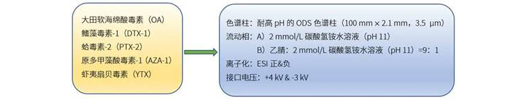 本方案使用碱性流动相分析扇贝萃取液中的脂溶性贝毒。萃取和分析步骤依据欧盟LC-MS/MS Ver.5测定软体动物中亲脂性海洋生物毒素的统一操作流程。