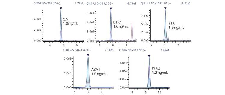 贝类营养价值高,味道鲜美,是大海馈赠给人类的礼物,只是人们在大快朵颐的同时也要小心毒素的残留。通过在方法中设置自动进样器的预处理功能,可自动配制高精度的基质匹配标准曲线,扇贝中5种脂溶性贝类毒素的检测方法灵敏度高、线性良好,加标回收率高。