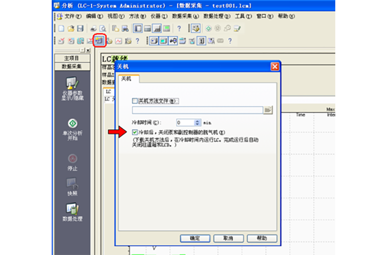 l 在分析工作结束后,请使用LabSolutions-仪器-关机功能,停止真空泵的运转,降低真空泵的磨损,延长真空泵的使用寿命。如下图: