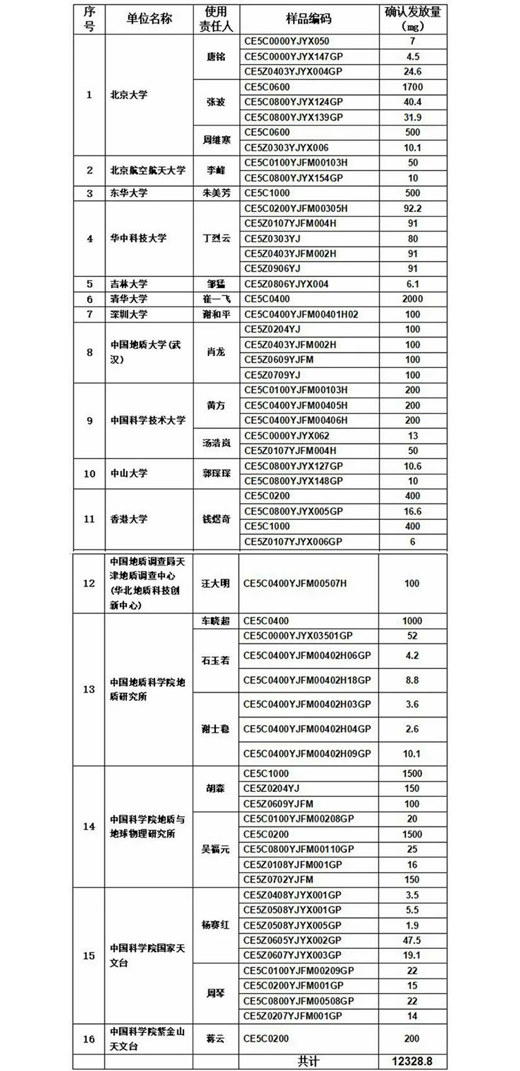 2023年5月,探月与航天工程中心(月球样品管理办公室)在北京组织召开了第六次月球科研样品借用申请评审会。经专家委员会评审,探月与航天工程中心审核,最终16家科研机构的60份申请获得通过,对应23名使用责任人,样品发放量共计12328.8mg。