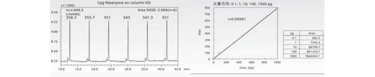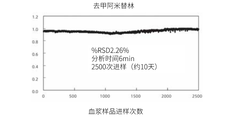 在血浆中添加样品,加入乙腈,离心除蛋白后,在10天中,连续进样1μL。其结果重现性为2.26%,证明了出色的长期稳定性。