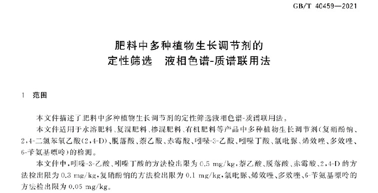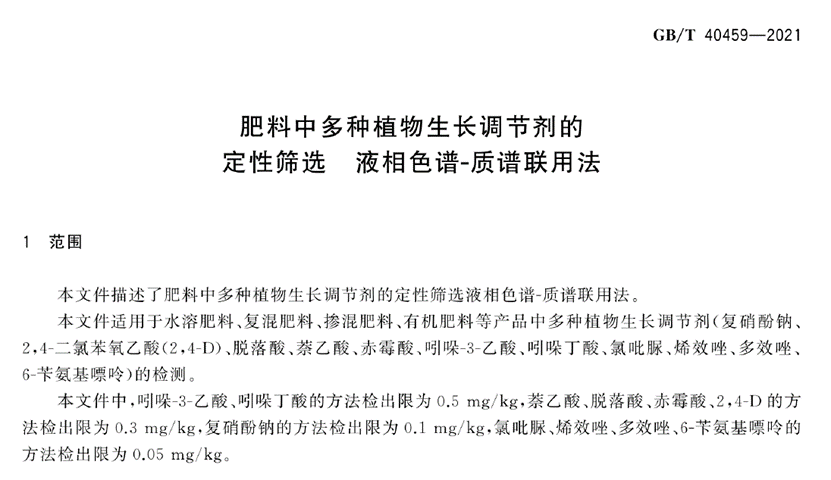 近期,国家市场监督管理总局发布了《GB/T 40459-2021肥料中多种植物生长调节剂的定性筛选 液相色谱-质谱联用法》,标准将于2022年的3月1日正式实施。