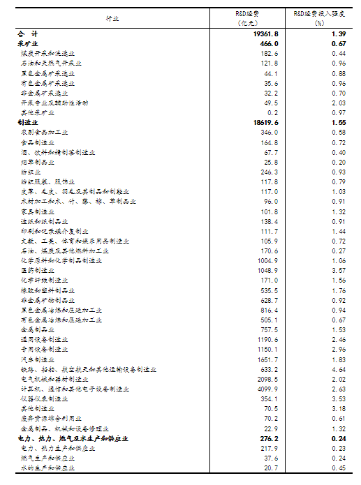 分产业部门看,高技术制造业研究与试验发展(R&D)经费6507.7亿元,投入强度(与营业收入之比)为2.91%,比上年提高0.20个百分点。在规模以上工业企业中,研究与试验发展(R&D)经费投入超过千亿元的行业大类有7个,比上年增加2个,这7个行业的经费占全部规模以上工业企业研究与试验发展(R&D)经费的比重为63.2%(详见附表1)。