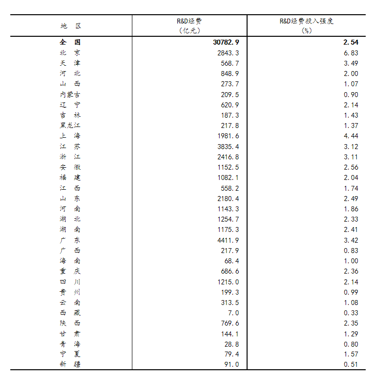 分地区看,研究与试验发展(R&D)经费投入超过千亿元的省(市)有12个,分别为广东(4411.9亿元)、江苏(3835.4亿元)、北京(2843.3亿元)、浙江(2416.8亿元)、山东(2180.4亿元)、上海(1981.6亿元)、湖北(1254.7亿元)、四川(1215亿元)、湖南(1175.3亿元)、安徽(1152.5亿元)、河南(1143.3亿元)和福建(1082.1亿元)。研究与试验发展(R&D)经费投入强度(与地区生产总值[4]之比)超过全国平均水平的省(市)有7个,依次为北京(6.83%)、上海(4.44%)、天津(3.49%)、广东(3.42%)、江苏(3.12%)、浙江(3.11%)和安徽(2.56%)(详见附表2)。