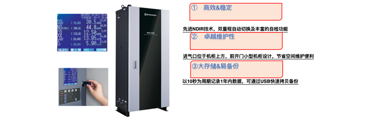 (2)烟气CEMS系统NSA3090:适应超低排放烟气测量的先进技术,配合先进NDIR(非分散红外)技术,双量程自动切换及丰富的自检功能,确保设备可以进行多种气体成分(SO2、NOx、CO、CO2、O2等)的连续稳定监测,薄型机柜便于维护,测定数据可以以10秒为周期记录1年,通过配备的USB插口快速拷贝。