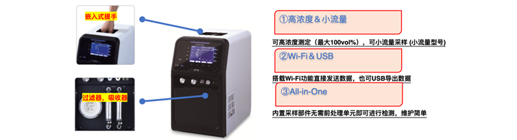 (1)便携式气体浓度分析仪CGT-7100:内置泵,过滤器,电子冷却器等前处理系统,仅需在气体进口通入样气,即可进行CO、CO2、CH4及O2等气体浓度的检测。过滤器,吸收器等安装在仪器正面,方便更换维护。