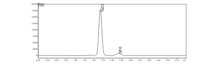 反吹放空技术的采用避免了水进入ECD,中心切割放空技术的使用避免了氧气对ECD的干扰,保证了分析结果的准确性和灵敏度。六氟化硫(SF6)气体的GWP值(GWP指在100年的时间期限内,各种温室气体的温室效应对应于相同效应的二氧化碳的质量)是CO2的23900倍,温室效应尤其显著。该方案在不做任何调整的情况下可分析大气中痕量SF6,检测下限可达ppt级。