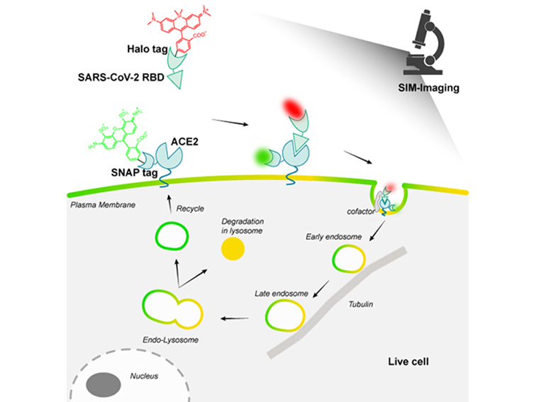 新冠病毒感染始于病毒的RBD与宿主细胞血管紧张素转换酶2(ACE2)的结合,之后经历多阶段、多分子的协同作用内吞感染细胞。但这一过程极易受环境干扰,病毒内吞的许多关键调控分子和感染细节目前仍然未知。而在活细胞水平上对病毒感染细胞过程的高时空分辨追踪,能够全面、真实地揭示病毒的感染机制。