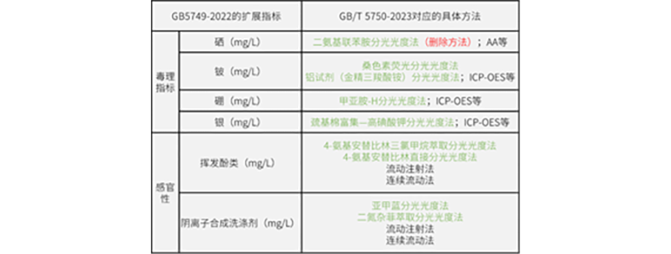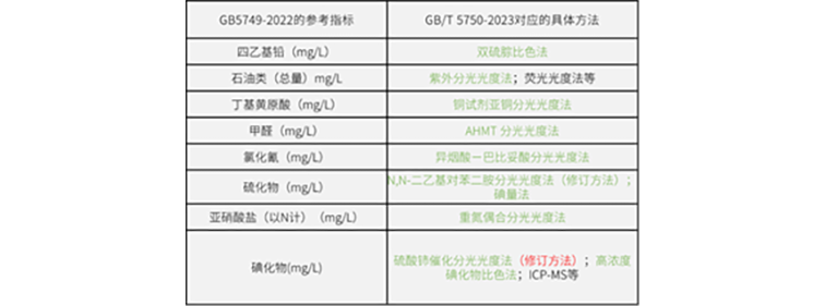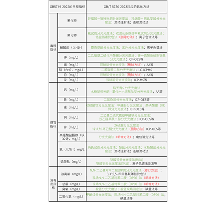 从新增方法来看,常规指标高锰酸钾指数新增了分光光度法,游离氯和总氯新增了现场N,N-二乙基对苯二胺(DPD)法。参考指标中无新增方法。这说明了新版GB/T 5750-2023的更新主要体现在方法的便利性、时效性,如高锰酸钾指数新增的分光光度法,相比之前的滴定法,操作更加方便。