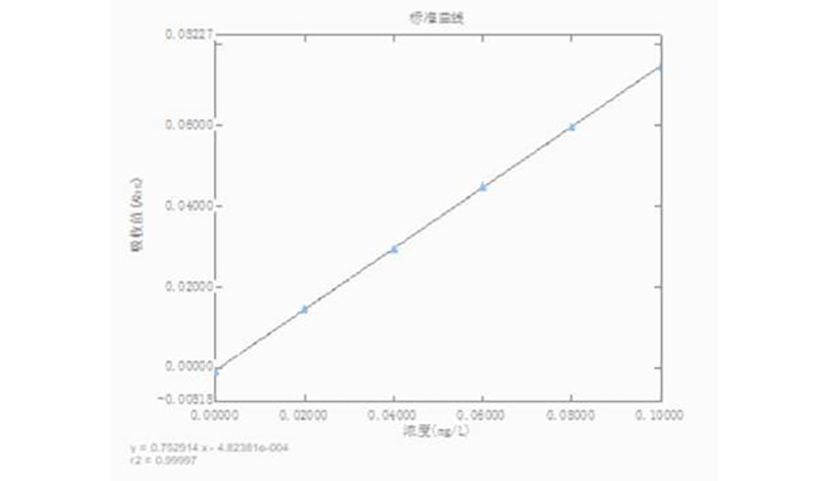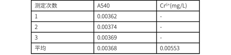 六价铬的常规测定方案为UV-2600i搭配10 mm方形比色皿,先制作标准曲线,再确定未知样品含量。取50mL 自来水样,另取0、1、2、3、4、5mL标准溶液于50mL比色瓶中定容至刻度,向水样及各标准溶液中各加2.5mL硫酸溶液及2.5mL二苯碳酰二肼溶液,立即混匀,放置10min,于540 nm波长,用10mm比色皿,以纯水为参比,测定吸光度。