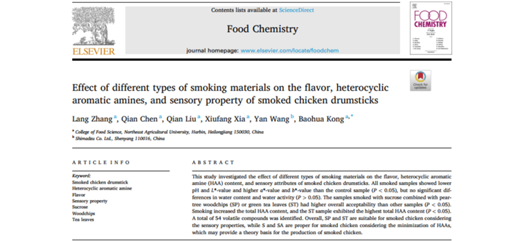 Lang Zhang, Qian Chen, Qian Liu, Xiufang Xia, Yan Wang, Baohua Kong*. Effect of different types of smoking materials on the flavor, heterocyclic aromatic amines, and sensory property of smoked chicken drumsticks. Food Chemistry, 2022, 367: 130680.