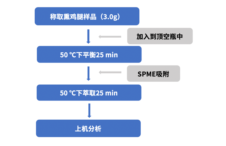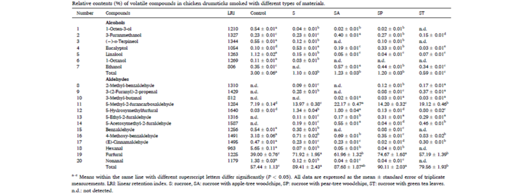 蔗糖结合梨木、苹果木或茶叶能够改善熏鸡腿的感官特性,其中蔗糖结合梨木熏制的鸡腿中含有较高含量的极性、非极性和总杂环胺。不同熏制材料熏制的鸡腿中醇类和醛类含量无明显差异,而酮类、酸类、酚类和呋喃类含量具有显著性的差异。使用气相-质谱联用仪和液相-质谱联用仪可以定性和定量检测到熏鸡腿中挥发性化合物和杂环胺。部分研究结果如下: