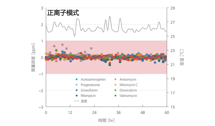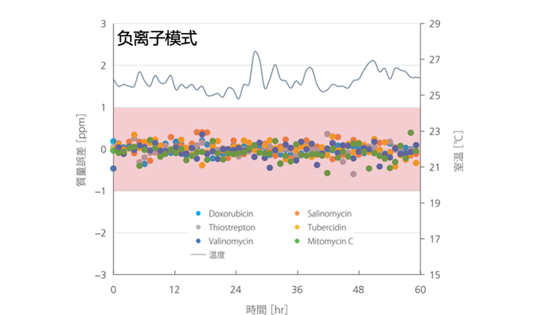 LCMS-9050无论正/负离子采集模式下,不同质量化合物(m/z150~1500)在长达60小时的测试周期内,质量数误差未超出1 ppm,显示了高质量精度下极好的数据稳定性。稳定的质量数对于未知物鉴定客户可谓福音,让未知变已知成为可能。