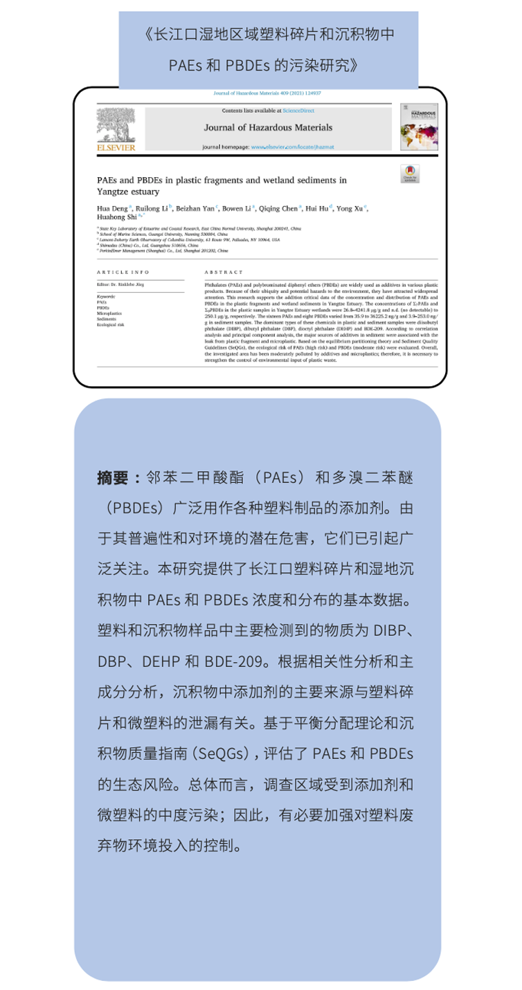 在《Journal of Hazardous Materials》(IF 14.224/Q1)论文中,作者选取了崇明岛地区、长江口南支地区和杭州湾地区三个区域作为研究对象,使用岛津Py-GCMS分析了长江口塑料碎片中邻苯二甲酸酯(PAEs)和多溴二苯醚(PBDEs)的浓度和空间分布情况。其中,塑料碎片中PAEs的浓度分布在26.8 ~ 4241.8 μg/g之间,最高浓度的点位位于长江口南支。DEHP是最主要的邻苯二甲酸酯类污染物,其次是DIBP和DBP。PBDEs的检出率相对较低。通过分析研究,为调查区域的污染水平提供了详实的数据,并进行了生态风险评价,揭示了该调查区域受到添加剂和微塑料的中度污染。有必要加强塑料垃圾的管控和治理。