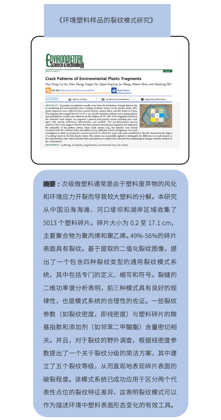 近日,岛津分析中心与华东师范大学河口海岸学国家重点实验室施华宏教授课题组合作,通过采集沿海、河口和湖泊等地区大量环境塑料碎片,使用Py-GCMS技术分析了塑料碎片中富集的多类添加剂含量,深入研究了环境塑料碎片及其裂纹的分类、表征和评估体系。其研究成果相继发表在环境领域知名期刊《Journal of Hazardous Materials》和《Environmental Science & Technology》上(均为一区TOP期刊)。