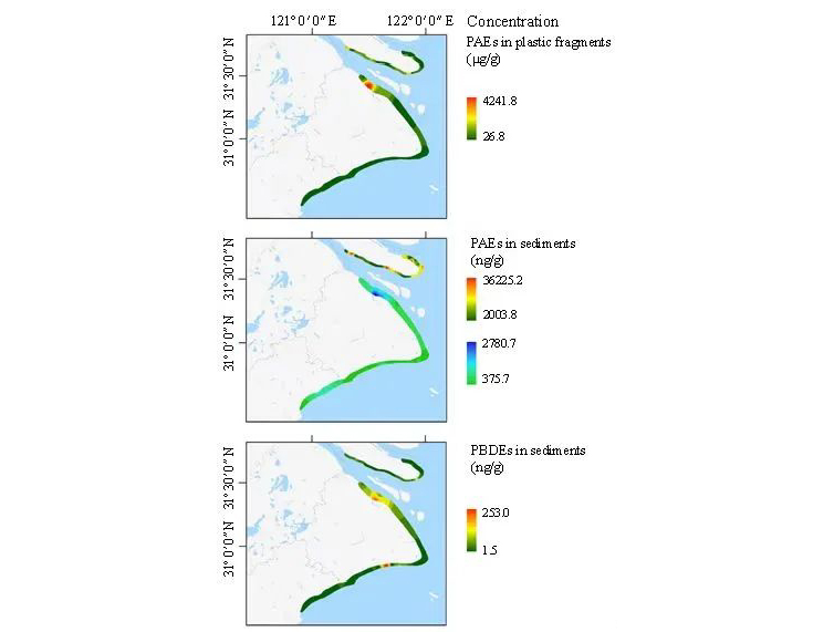 图5. 长江口塑料碎片和沉积物中PAEs和PBDEs的浓度和空间分布规律