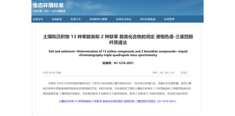 HJ 1210-2021《土壤和沉积13种苯胺类和2种联苯胺类化合物的测定 液相色谱-三重四极杆质谱法》,主要适用于土壤和沉积物中苯胺和联苯胺化合物的测定,在今年6月1日正式实施。