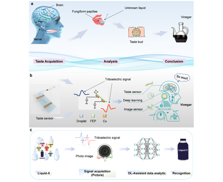 舌头上的味蕾帮助人们感受味道,每个味蕾中均有能分辨不同味道的味觉细胞。现阶段虽然无法完全复刻人类味觉系统的感知机制,但研究人员发现,当不同液滴滑过传感电极时,可以主动产生蕴含独特特征的摩擦电信号。