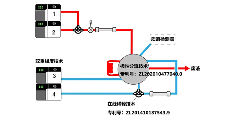 l 高效在线稀释 专利技术,可实现大体积强溶剂中目标物的在线稀释,并达到目标物在反相色谱柱的柱头聚焦的效果。