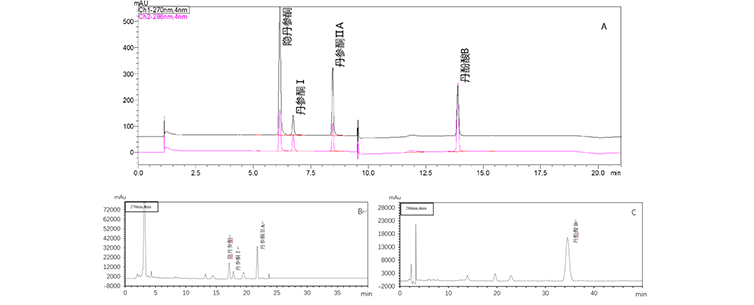 A全谱二维同时分离丹参四种活性物质;B、C药典需分开两个方法分离