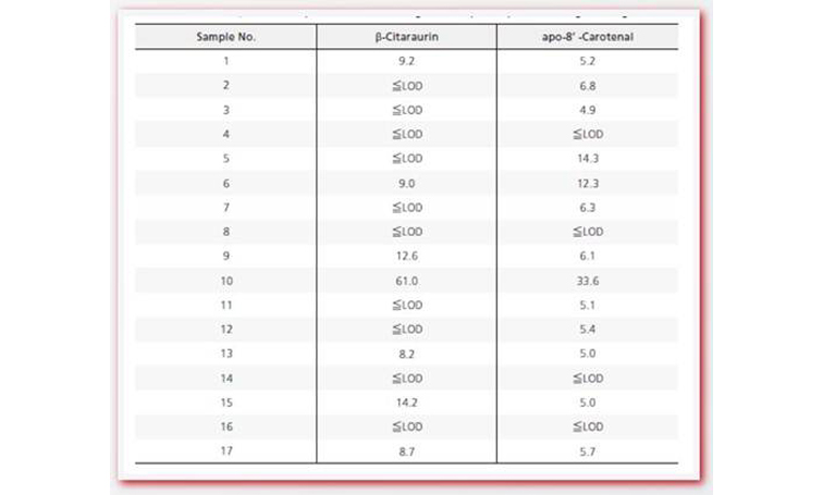 研究表明,在17种辣椒品种中均存在不同类型的类胡萝卜素和类胡萝卜素脂肪酸酯,可能是由于不同品种中发生不同的主要类胡萝卜素氧化裂解途径所导致。使用岛津Nexera UC全相系统在辣椒品种中检测到不同组分ε-apoluteinas和4-oxo-apo-β- carotenals。Nexera UC体现出了前处理操作简单、提取能力更强,有利于发现常规萃取方式无法发现的“目标物”等显著优势。